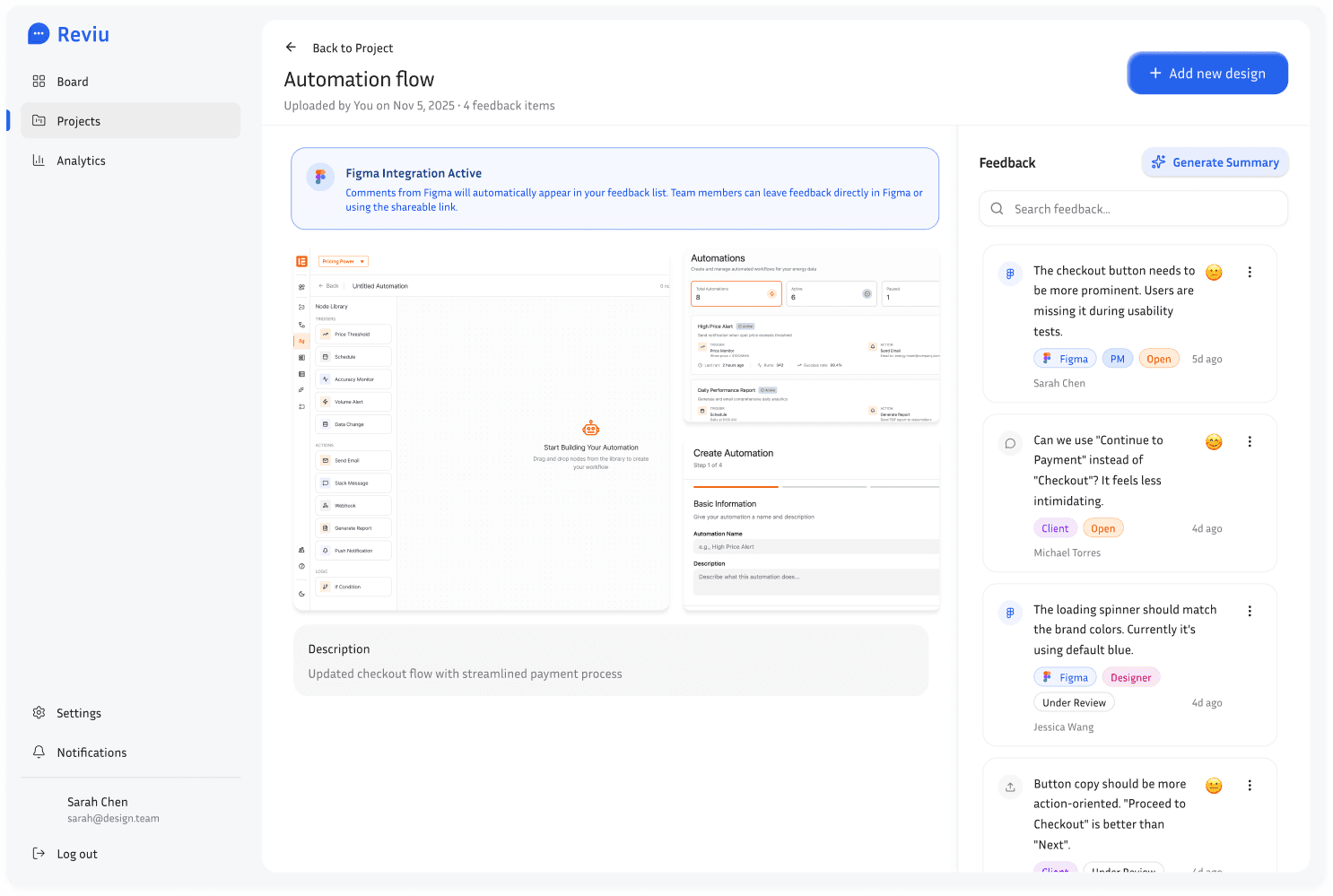 Reviu helps designers organize, analyze, and act on feedback from clients, PMs, and developers—all in one calm, central space.
